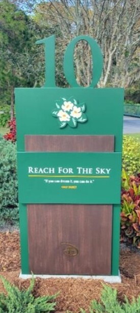 **Hole #10: Reach for the Sky** -- Par 5 / 430 yards up to 526 yards. This wide-fairway hole encourages aggressive play down the right side. Layup options left keep approach angles simple. The elevated back-to-front sloping green offers birdie or eagle opportunities. Disney's philosophy: "If you can dream it, you can do it!"