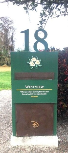 **Hole #18: Westview** -- Par 4 / 355 yards up to 492 yards. This closing hole faces the setting sun and demands strong, accurate tee shots. The green slopes rightward toward water, requiring belief in long-iron execution. Walt Disney's guidance: "When you believe in a thing, believe in it all the way, implicitly and unquestionably."