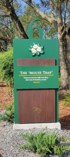**Hole #6: The Mouse Trap** -- Par 3 / 107 yards up to 231 yards. This deceptively elevated hole demands club selection caution. The Mickey-inspired front bunker ensures remembrance of Walt Disney's reminder: "I hope we never lose sight of one thing -- that it was all started by a mouse."